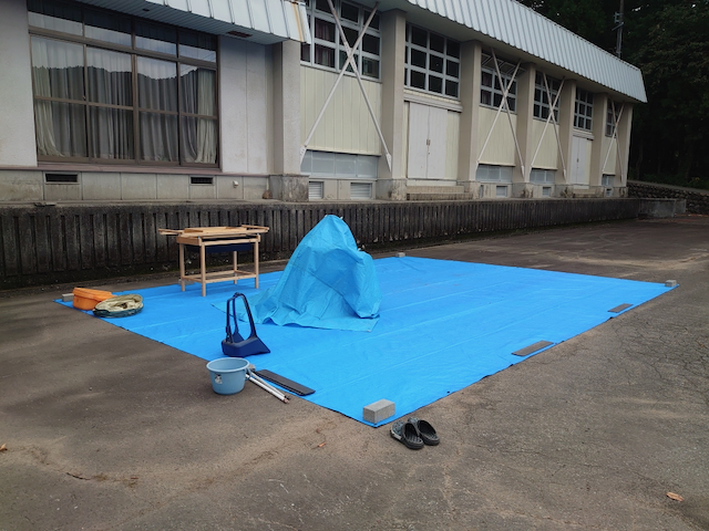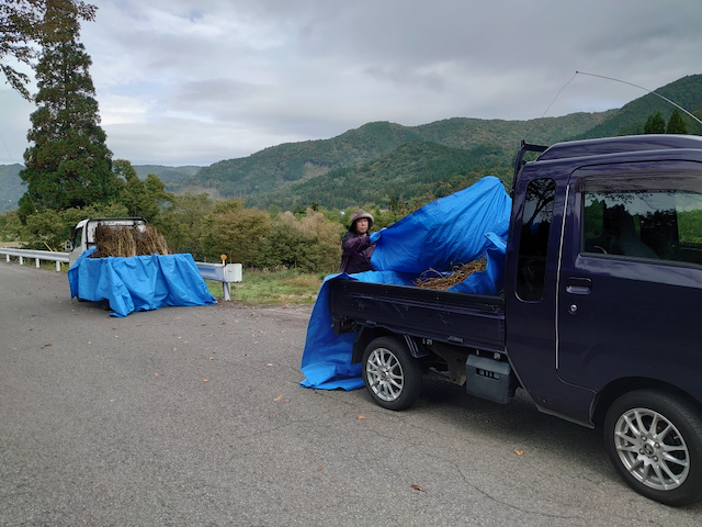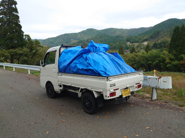 荷台に載せ終えたら、写真の様にブルーシートで包んで集会所まで運びます。