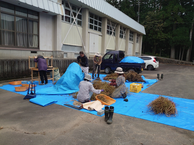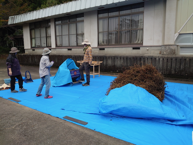 昨年までは圃場で脱穀を行ないましたが、今年の圃場は狭く、また畝で平坦部が無いので作業がやりにくいので、今年は脱穀作業を六ノ里集会所で行う事としました。