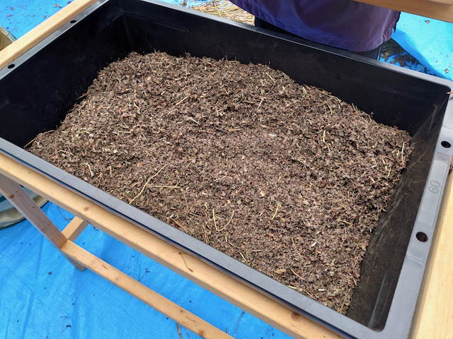 収穫した実から小石を取り除くのに苦労しますので、今年も作業スペースのブルーシート上を土足禁止としています。