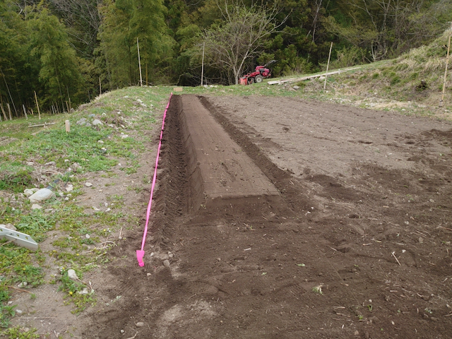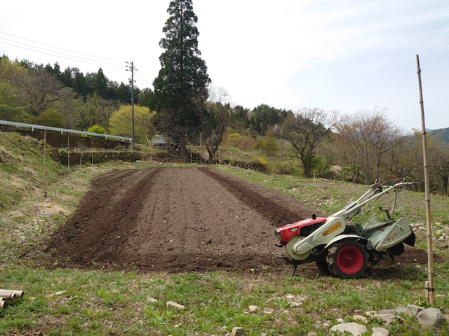 耕運機で耕した後、畝立て専用機でジャガイモ用の畝を立てておきました。