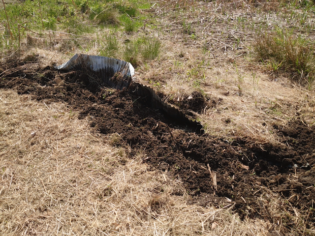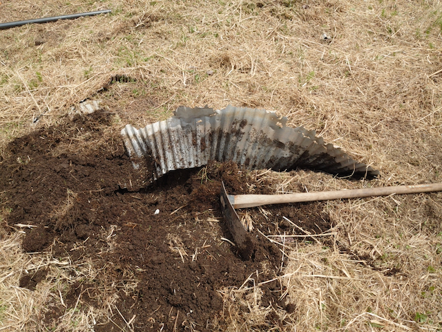 耕すのが終わった所から鍬で土を退かせて、プラ製トタンを引っ張り出します。