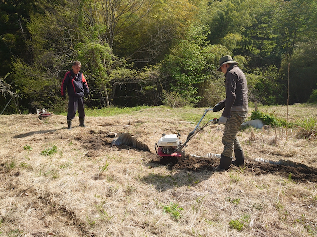 作業数日前、土の乾き具合を見て、まずは耕運機で耕します。