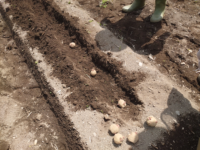 まず畝の真ん中に鍬で溝を掘って、30センチくらいの間隔で種芋を置いていきます。