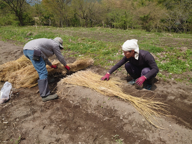 最後に過度な乾燥とならない様に、植えた畝の上に藁を敷き詰めます。